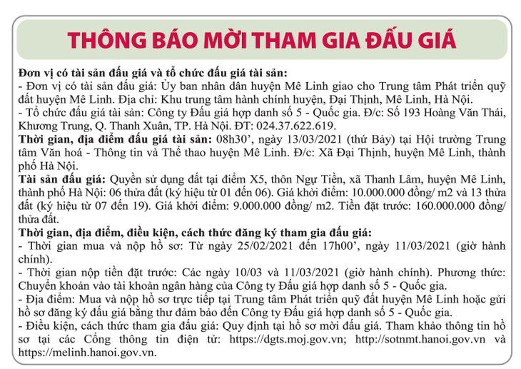 (BĐT) - Công ty Đấu giá hợp danh Số 5 – Quốc gia phối hợp Trung tâm Phát triển quỹ đất huyện Mê Linh thông báo đấu giá tài sản vào ngày 13/3/2021 do UBND huyện Mê Linh ủy quyền như sau: