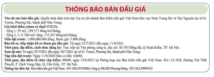 Ngày 13/8/2021, đấu giá quyền thuê diện tích sàn trụ sở Bảo hiểm tiền gửi Việt Nam tại TP.Nha Trang, Khánh Hòa