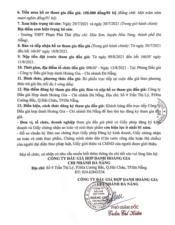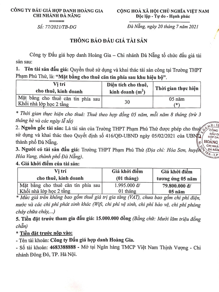 Quyền thuê sử dụng và khai thác tài sản công tại Trường THPT Phạm Phú Thứ: “Mặt bằng cho thuê căn tin phía sau khối nhà lớp học 2 tầng”.