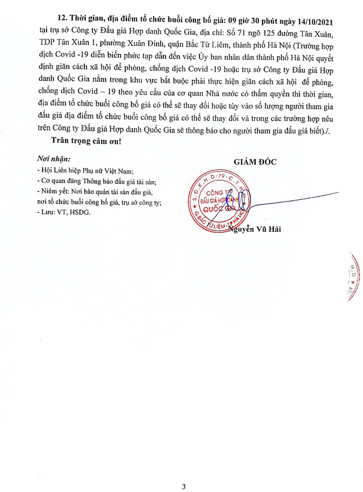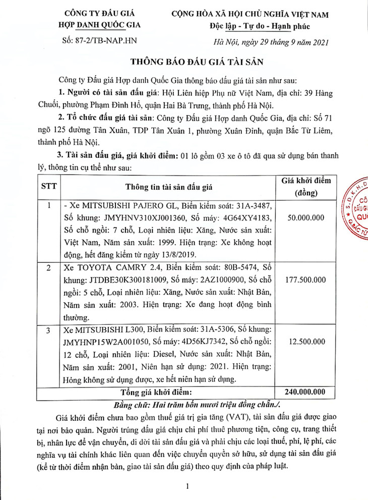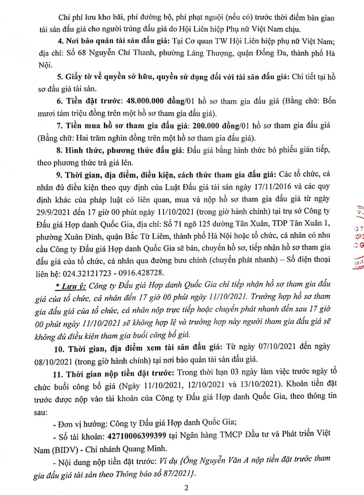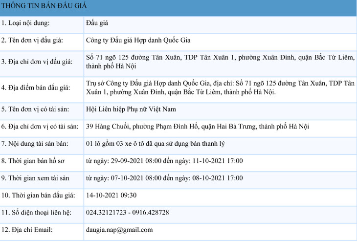 (BĐT) - Công ty Đấu giá hợp danh Quốc Gia thông báo đấu giá tài sản vào ngày 14/10/2021 do Hội Liên hiệp Phụ nữ Việt Nam ủy quyền như sau: