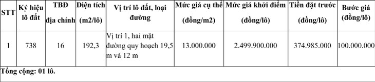 1. Tổng số lô đất đấu giá: 01 lô đất.
