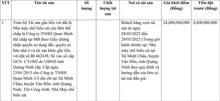 Thông tin về tài sản đấu giá, giá khởi điểm, tiền đặt trước: