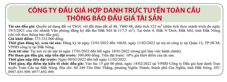 (BĐT) - Công ty Đấu giá hợp danh trực tuyến Toàn Cầu thông báo đấu giá tài sản vào ngày 14/2/2022 như sau: