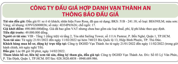 (BĐT) - Công ty Đấu giá hợp danh Vạn Thành An thông báo đấu giá tài sản vào ngày 14/2/2022 do Ngân hàng TMCP Quốc tế Việt Nam (VIB) ủy quyền như sau: