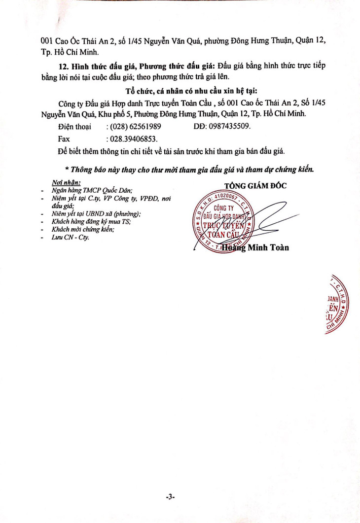 Địa điểm: Trụ sở Công ty Đấu giá Hợp danh Trực tuyến Toàn Cầu, địa chỉ: số 001 Cao Ốc Thái An 2, số 1/45 Nguyễn Văn Quá, phường Đông Hưng Thuận, Quận 12, Tp. Hồ Chí Minh