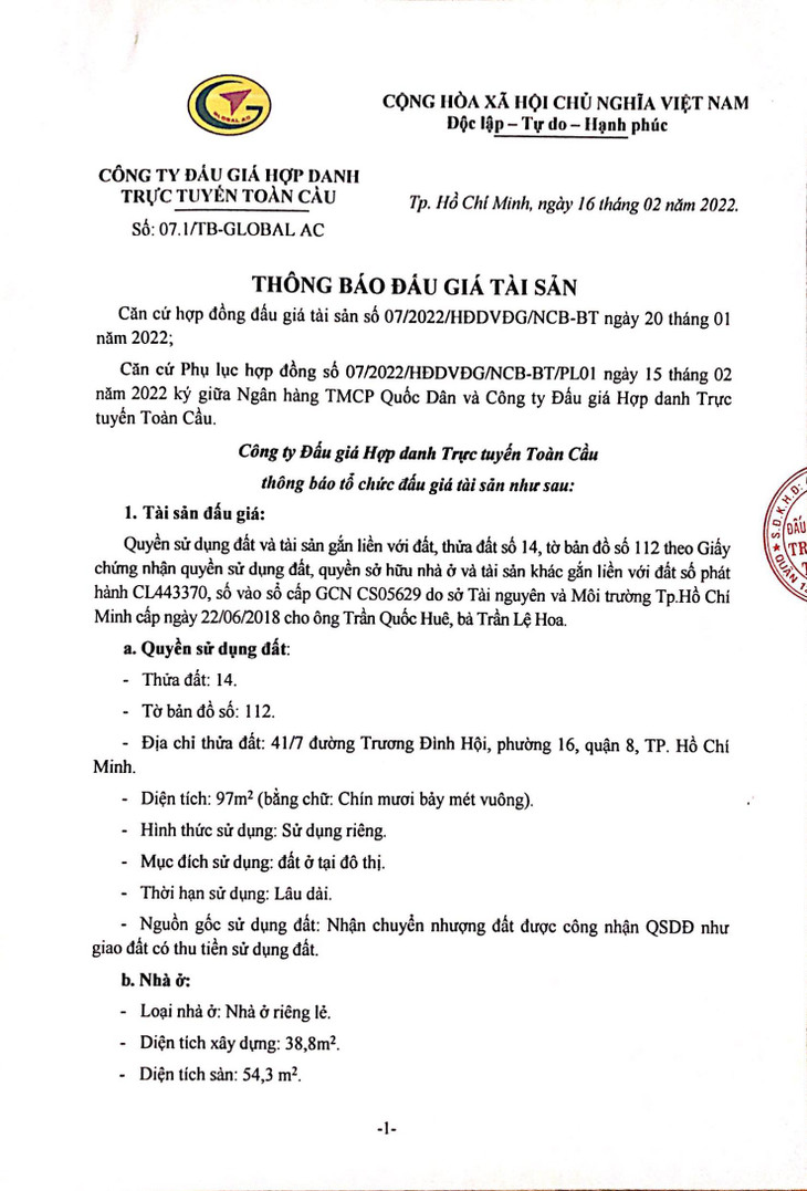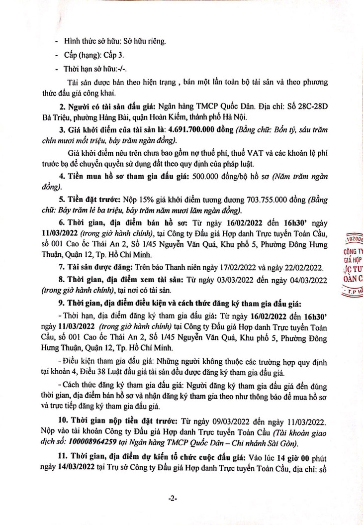 Tên Người có tài sản đấu giá: Ngân hàng TMCP Quốc Dân
