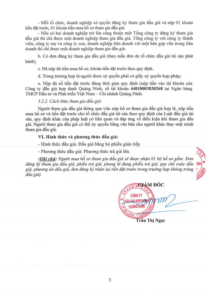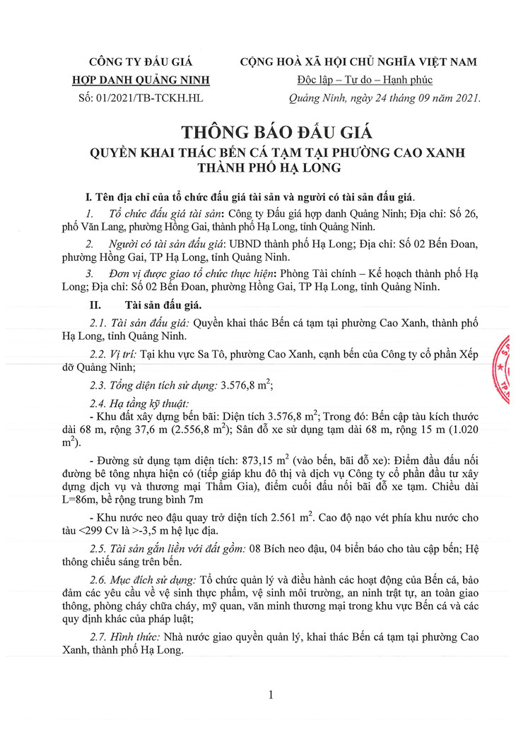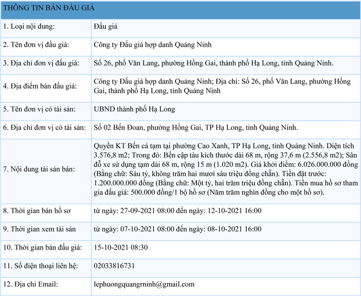 (BĐT) - Công ty Đấu giá hợp danh Quảng Ninh thông báo đấu giá tài sản vào ngày 15/10/2021 do UBND thành phố Hạ Long ủy quyền như sau: