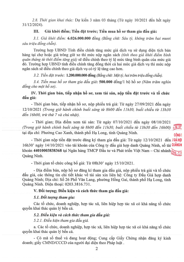 Quyền khai thác Bến cá tạm tại phường Cao Xanh, thành phố Hạ Long, tỉnh Quảng Ninh. Diện tích 3.576,8 m2; Trong đó: Bến cập tàu kích thước dài 68 m, rộng 37,6 m (2.556,8 m2); Sân đỗ xe sử dụng tạm dài 68 m, rộng 15 m (1.020 m2). Giá khởi điểm: 6.026.000.000 đồng (Bằng chữ: Sáu tỷ, không trăm hai mươi sáu triệu đồng chẵn). Tiền đặt trước: 1.200.000.000 đồng (Bằng chữ: Một tỷ, hai trăm triệu đồng chẵn). Tiền mua hồ sơ tham gia đấu giá: 500.000 đồng/1 bộ hồ sơ (Năm trăm nghìn đồng cho một hồ sơ).