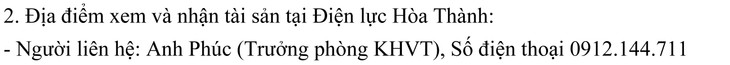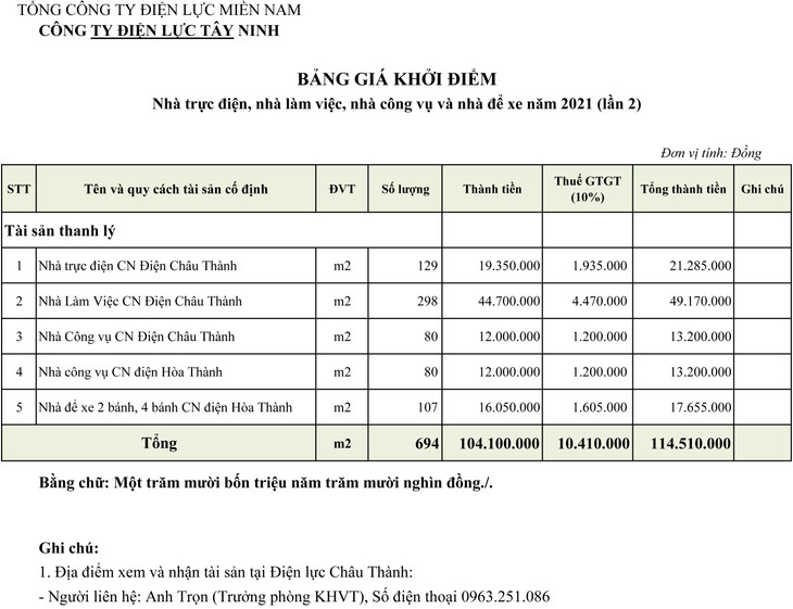 - Tài sản thanh lý vật tư thu hồi tháo dỡ nhà trực điện, nhà làm việc, nhà công vụ và nhà để xe tại Điện lực Châu Thành và Điện lực Hòa Thành. - Giá khởi điểm: 114.510.000 đồng (đã bao gồm VAT). - Tiền đặt trước: 17.500.000 đồng. Tiền bán hồ sơ tham gia đấu giá: 200.000 đồng. - Đấu giá bằng bỏ phiếu gián tiếp theo phương thức trả giá lên. - Điều kiện, cách thức đăng ký gồm: mẫu Đơn đăng ký đấu giá, mẫu giấy xem tài sản (theo mẫu Trung tâm), bản sao giấy CMND, bản sao giấy chứng nhận đăng ký kinh doanh đúng ngành nghề. - Thời gian, địa điểm tham khảo, đăng ký và nộp hồ sơ trong giờ hành chính từ ngày ra thông báo đến hết 15 giờ, ngày 12/10/2021 (thứ ba). Xem tài sản ngày 01&04/10/2021, tại nơi có tài sản. - Tổ chức đấu giá: 14 giờ 30 phút, ngày 15/10/2021 (thứ sáu). - Địa điểm đăng ký mua, nộp hồ sơ và tổ chức đấu giá tại: Trung tâm Dịch vụ đấu giá tài sản tỉnh Tây Ninh.