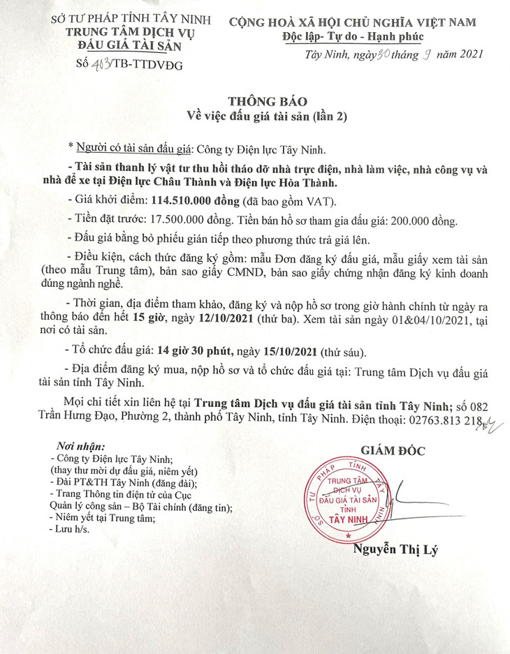 (BĐT) - Trung tâm Dịch vụ đấu giá tài sản tỉnh Tây Ninh thông báo đấu giá tài sản vào ngày 15/10/2021 do Công ty Điện lực Tây Ninh ủy quyền như sau: