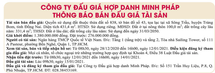 (BĐT) - Công ty Đấu giá hợp danh Minh Pháp thông báo đấu giá tài sản vào ngày 15/1/2021 do Ngân hàng TMCP Quốc tế Việt Nam ủy quyền như sau:
