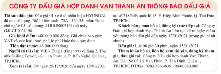 (BĐT) - Công ty đấu giá hợp danh Vạn Thành An thông báo đấu giá tài sản vào ngày 15/1/2021 do VIB ủy quyền như sau: