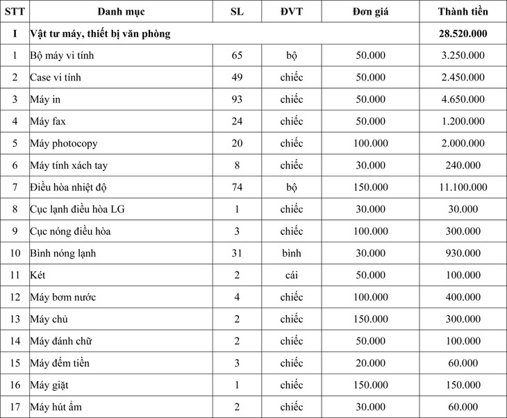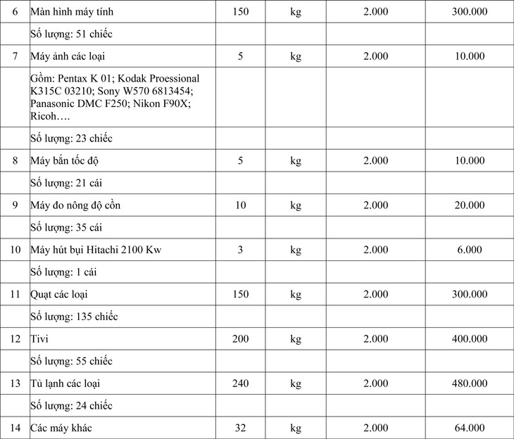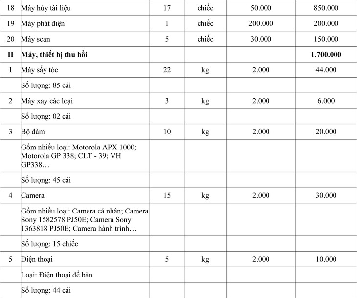 Đấu giá tài sản lô hàng trang thiết bị bao gồm: Máy tính case, laptop, máy in văn phòng, thiết bị, máy hỗ trợ công an giao thông, thiết bị nhà bếp, vật tư thu hồi (Bán gộp cả lô, không bán riêng lẻ, có bảng kê kèm theo).