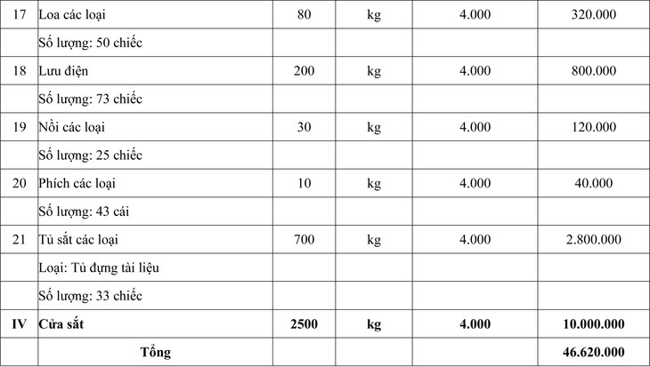 - Tổng giá khởi điểm của tài sản: 46.620.000 đồng (Bằng chữ: Bốn mươi sáu triệu sáu trăm hai mươi nghìn đồng).