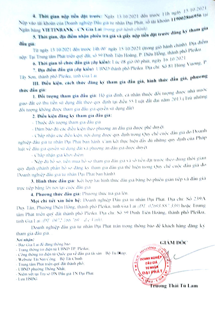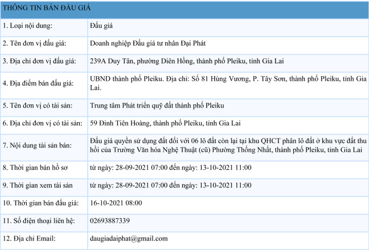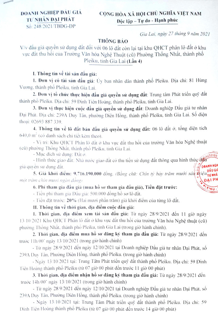 Đấu giá quyền sử dụng đất đối với 06 lô đất còn lại tại khu QHCT phân lô đất ở khu vực đất thu hồi của Trường Văn hóa Nghệ Thuật (cũ) Phường Thống Nhất, thành phố Pleiku, tỉnh Gia Lai