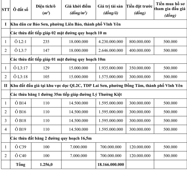 3. Tên tài sản, nơi có tài sản đấu giá; giá khởi điểm, tiền đặt trước, tiền mua hồ sơ tham gia đấu giá tài sản: Quyền sử dụng đất đối với 04 ô đất thuộc khu dân cư Bảo Sơn, phường Liên Bảo & 06 ô đất thuộc khu đất đấu giá tại khu vực dọc QL2C, TDP Lai Sơn, phường Đồng Tâm, thành phố Vĩnh Yên, cụ thể như sau: