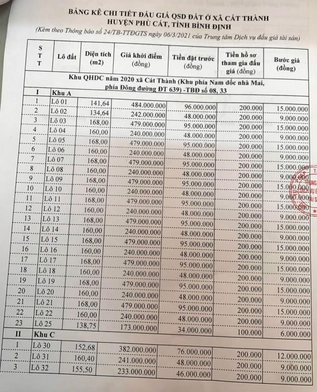 2. Diện tích, giá khởi điểm, khoản tiền đặt trước và tiền hồ sơ tham gia đấu giá, bước giá của từng lô đất. (kèm theo bảng kê chi tiết đấu giá quyền sử dụng đất ở ngày 06/3/2021 xã Cát Thành, huyện Phù Cát).