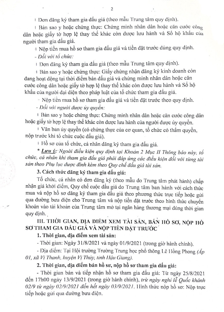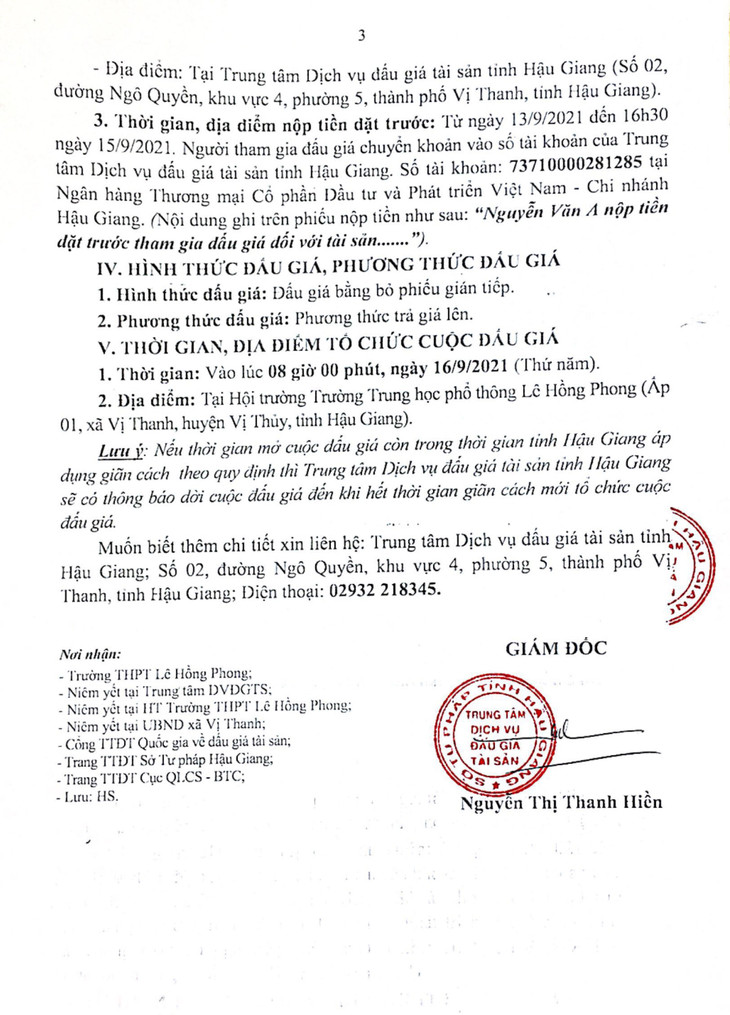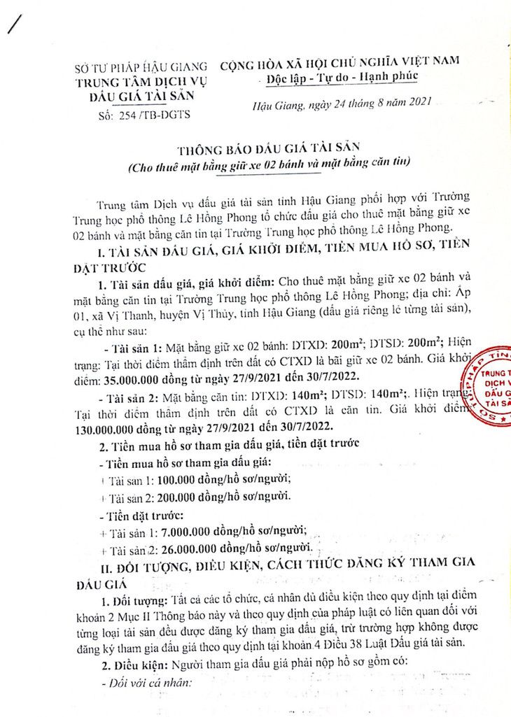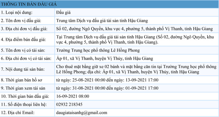 Cho thuê mặt bằng giữ xe 02 bánh và mặt bằng căn tin tại Trường Trung học phổ thông Lê Hồng Phong; địa chỉ: Ấp 01, xã Vị Thanh, huyện Vị Thủy, tỉnh Hậu Giang