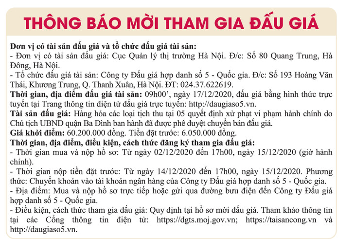 (BĐT) - Công ty Đấu giá hợp danh Số 5 – Quốc gia thông báo đấu giá tài sản vào ngày 17/12/2020 do Cục Quản lý thị trường Hà Nội ủy quyền như sau: