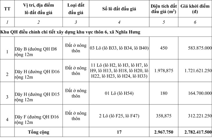 - Tổng số lô đất, diện tích đất đấu giá: 17 lô với tổng diện tích 2.967,750 m2; (kèm theo danh sách chi tiết).
