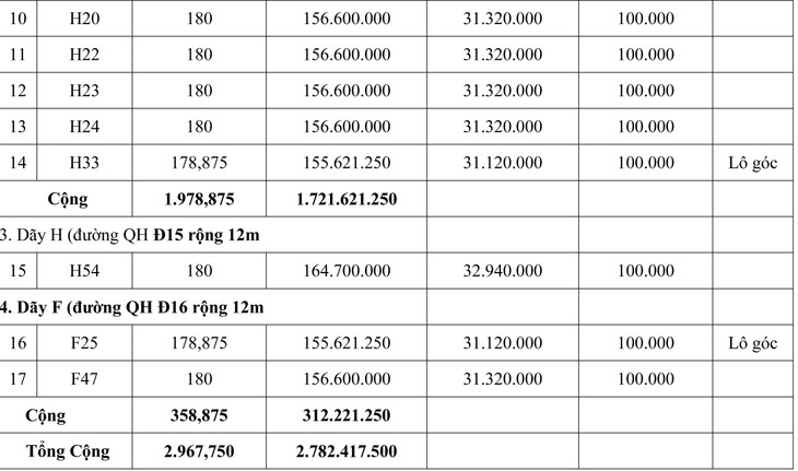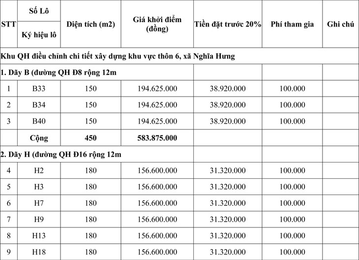 - Tiền đặt trước: 20% (Hai mươi phần trăm) giá khởi điểm của từng lô đất.