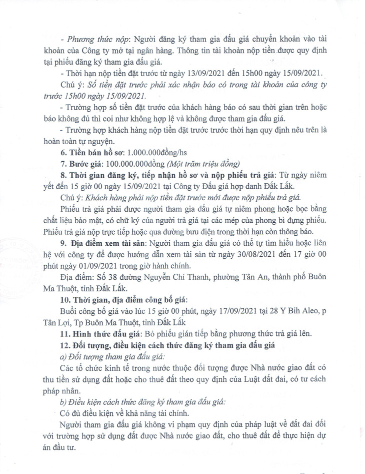 (BĐT) - Công ty Đấu giá hợp danh Đắk Lắk thông báo đấu giá tài sản vào ngày 17/9/2021 do Sở Tài chính tỉnh Đắk Lắk ủy quyền như sau: