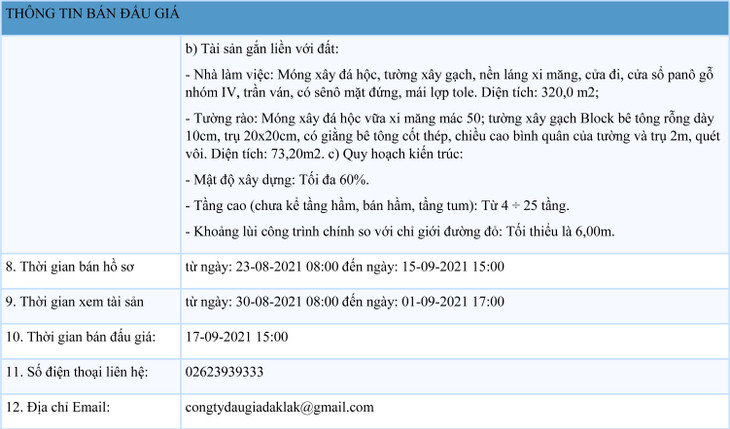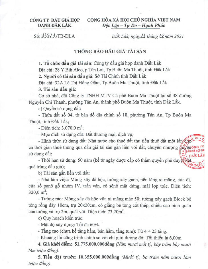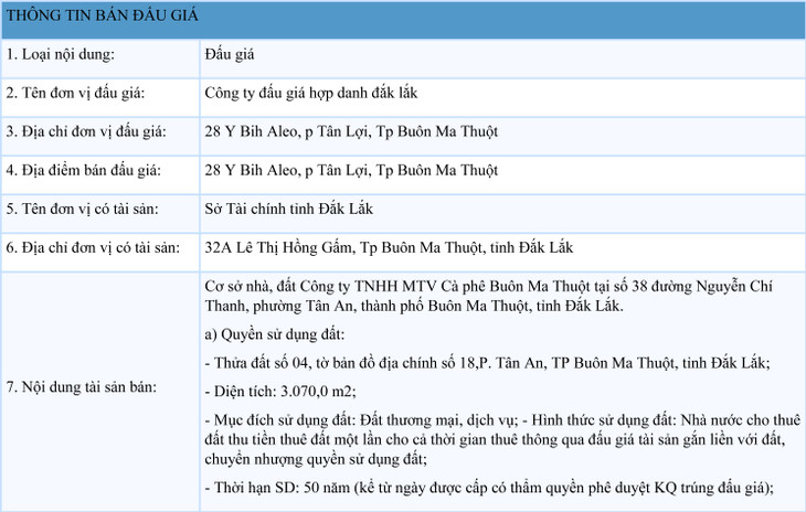 Cơ sở nhà, đất Công ty TNHH MTV Cà phê Buôn Ma Thuột tại số 38 đường Nguyễn Chí Thanh, phường Tân An, thành phố Buôn Ma Thuột, tỉnh Đắk Lắk. a) Quyền sử dụng đất: - Thửa đất số 04, tờ bản đồ địa chính số 18, phường Tân An, Tp Buôn Ma Thuột, tỉnh Đắk Lắk; - Diện tích: 3.070,0 m2; - Mục đích sử dụng đất: Đất thương mại, dịch vụ; - Hình thức sử dụng đất: Nhà nước cho thuê đất thu tiền thuê đất một lần cho cả thời gian thuê thông qua đấu giá tài sản gắn liền với đất, chuyển nhượng quyền sử dụng đất; - Thời hạn sử dụng: 50 năm (kể từ ngày được cấp có thẩm quyền phê duyệt kết quả trúng đấu giá); b) Tài sản gắn liền với đất: - Nhà làm việc: Móng xây đá hộc, tường xây gạch, nền láng xi măng, cửa đi, cửa sổ panô gỗ nhóm IV, trần ván, có sênô mặt đứng, mái lợp tole. Diện tích: 320,0 m2; - Tường rào: Móng xây đá hộc vữa xi măng mác 50; tường xây gạch Block bê tông rỗng dày 10cm, trụ 20x20cm, có giằng bê tông cốt thép, chiều cao bình quân của tường và trụ 2m, quét vôi. Diện tích: 73,20m2. c) Quy hoạch kiến trúc: - Mật độ xây dựng: Tối đa 60%. - Tầng cao (chưa kể tầng hầm, bán hầm, tầng tum): Từ 4 ÷ 25 tầng. - Khoảng lùi công trình chính so với chỉ giới đường đỏ: Tối thiểu là 6,00m.