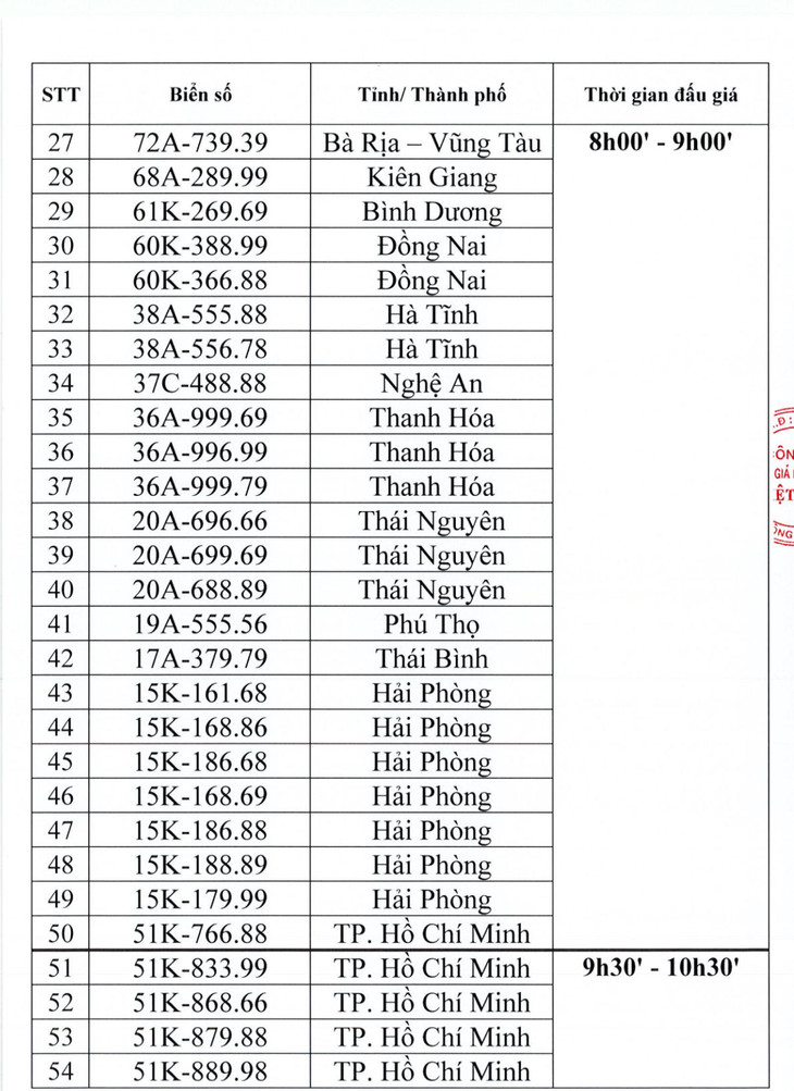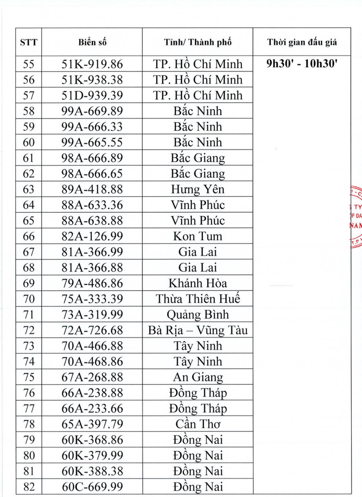 Trong đó có 12 biển tứ quý, như: 98A-655.55; 51K-877.77; 82A-122.22; 70A-477.77... Các biển số sẽ được đấu giá trong 4 khung giờ: 8h-9h, 9h30-10h30, 14h-15h và 15h30-16h30.