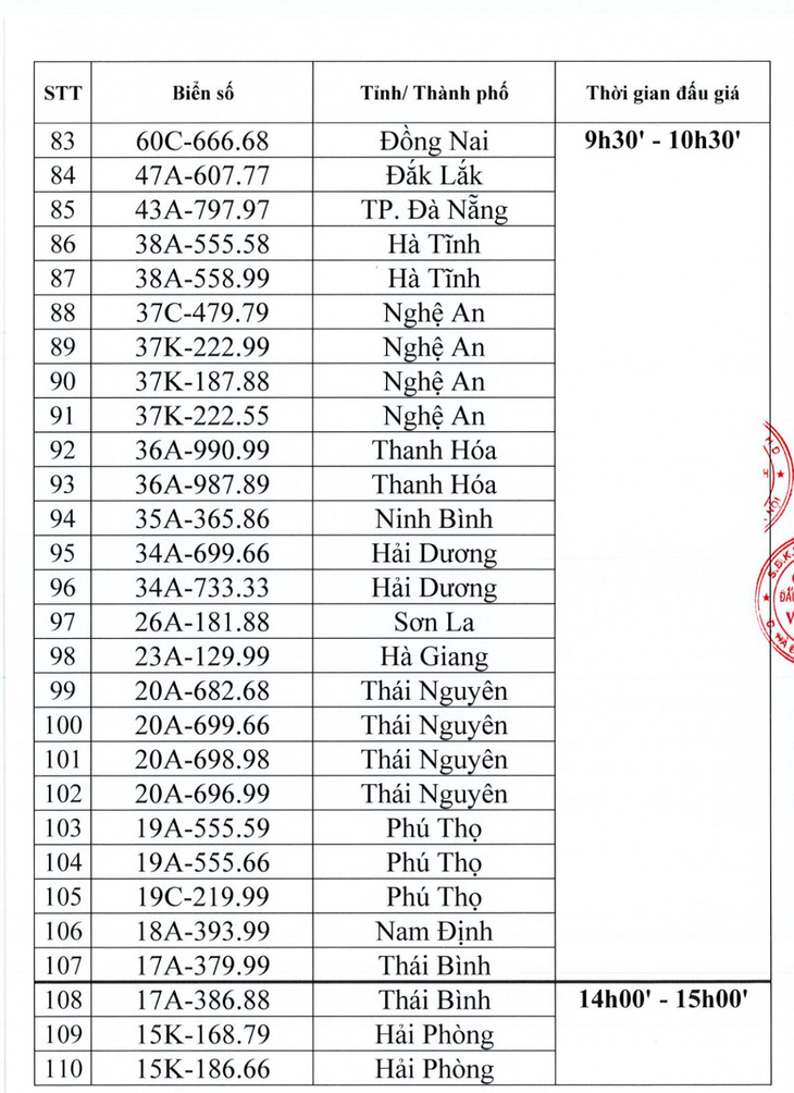Trước đó, từ 14h-16h30 ngày 17/10, Công ty Đấu giá hợp danh Việt Nam đã đưa 110 biển số xe ô tô lên sàn đấu giá online tại hai khung giờ.