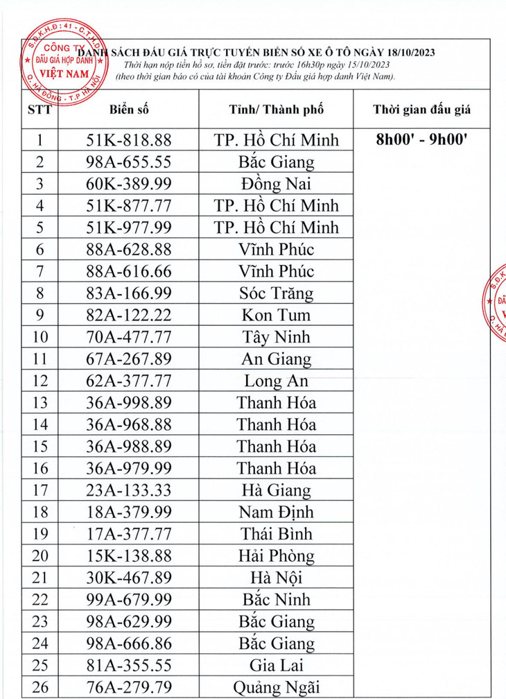 Dưới đây là danh sách biển số ô tô và các phiên đấu giá trực tuyến ngày 18/10:
