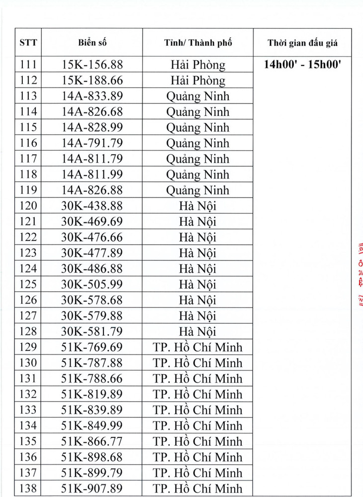 Công ty Đấu giá hợp danh Việt Nam (VPA) thông báo danh sách đấu giá trực tuyến biển số xe ô tô ngày 18/10. Theo đó, sẽ có 212 biển số sẽ lên sàn đấu giá vào ngày 18/10. Các phiên đấu giá biển số ô tô sẽ được tổ chức tại 4 khung giờ (8h - 9h, 9h30 - 10h30, 14h00 - 15h00, 15h30 - 16h30).