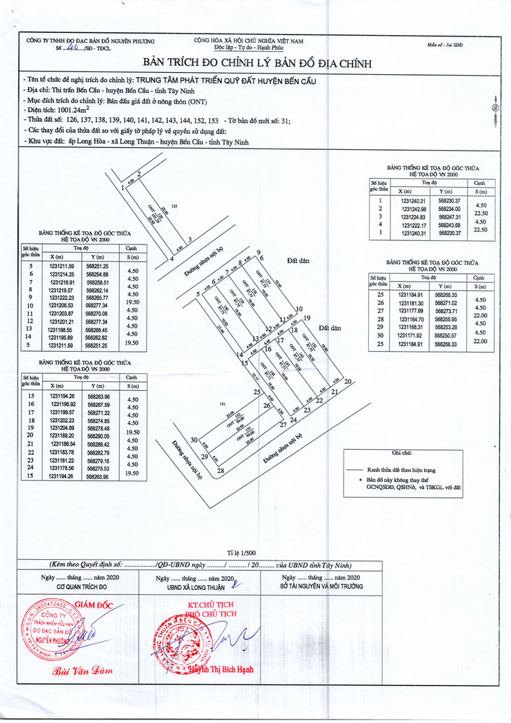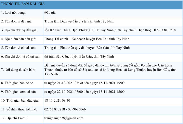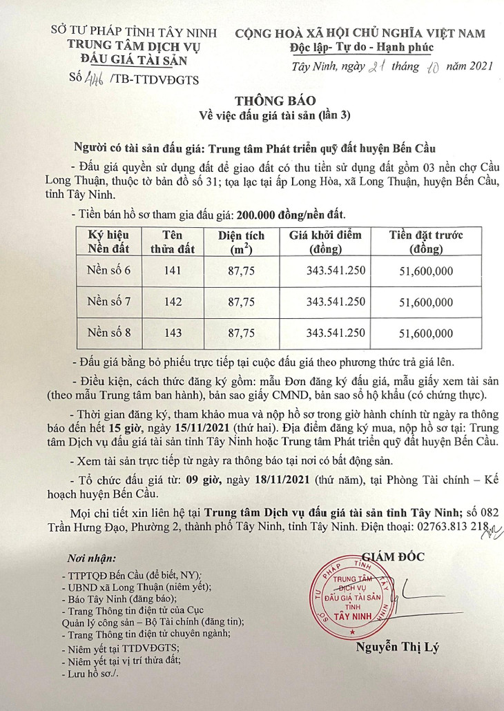 Đấu giá quyền sử dụng đất để giao đất có thu tiền sử dụng đất gồm 03 nền chợ Cầu Long Thuận, thuộc tờ bản đồ số 31; tọa lạc tại ấp Long Hòa, xã Long Thuận, huyện Bến Cầu, tỉnh Tây Ninh.