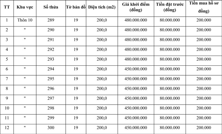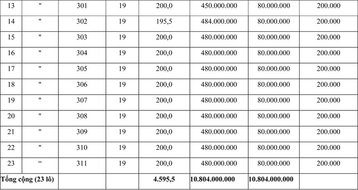 3. Tài sản đấu giá: Quyền sử dụng đất ở đối với 23 thửa đất tại xã Lý Trạch, huyện Bố Trạch, tỉnh Quảng Bình; Diện tích từ 195,5m2/thửa đến 200,0m2/thửa; Giá khởi điểm từ 450.000.000 đồng/thửa đến 484.000.000 đồng/thửa.