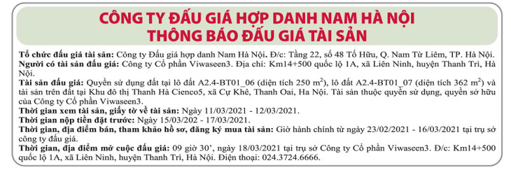 (BĐT) - Công ty Đấu giá hợp danh Nam Hà Nội thông báo đấu giá tài sản vào ngày 18/3/2021 do Công ty CP Viwaseen 3 ủy quyền như sau: