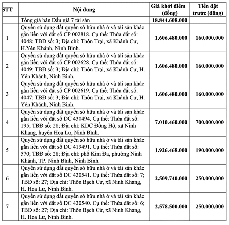 Tài sản đấu giá: Tài sản bảo đảm của khách hàng Công ty TNHH Trung Linh Phát gồm 7 tài sản được bán riêng lẻ theo từng tài sản, cụ thể bao gồm: