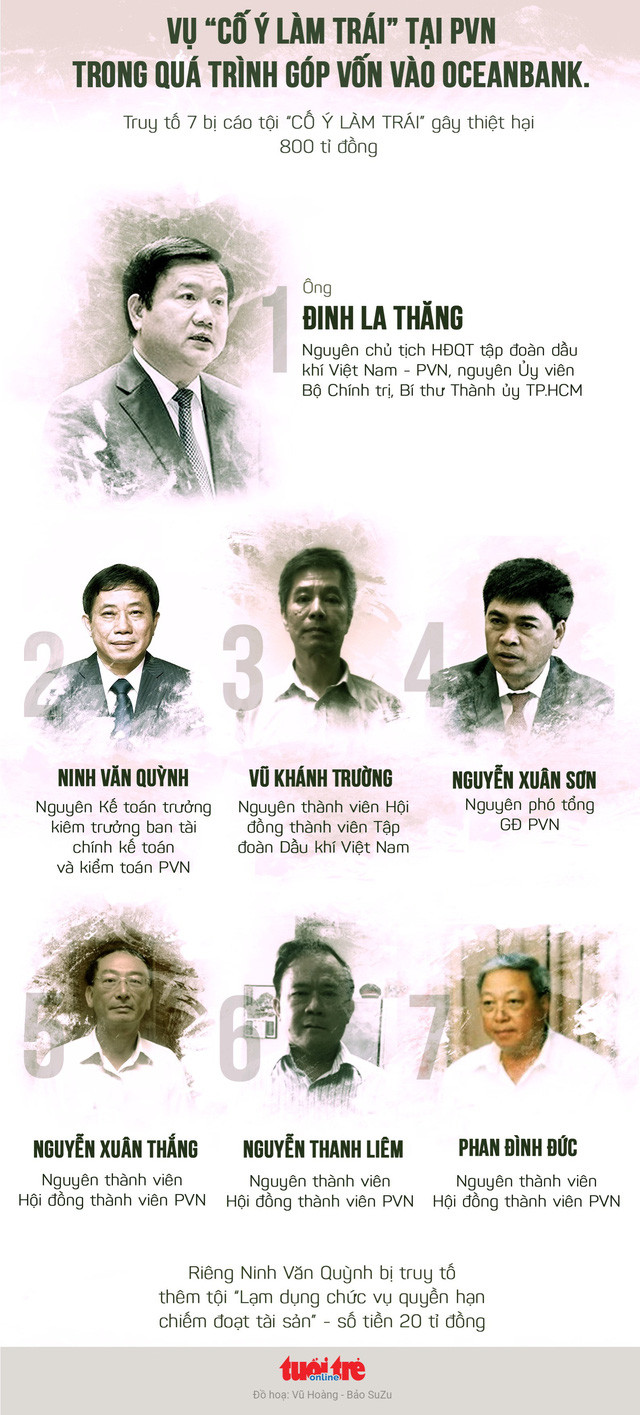 Các bị cáo bị đưa ra xét xử gồm: ông Đinh La Thăng - nguyên chủ tịch HĐQT PVN; Nguyễn Xuân Sơn - nguyên phó tổng giám đốc OceanBank; Nguyễn Xuân Thắng, Nguyễn Thanh Liêm, Vũ Khánh Trường, Phan Đình Đức (đều là nguyên thành viên Hội đồng thành viên PVN); Ninh Văn Quỳnh - phó tổng giám đốc Tập đoàn Dầu khí Việt Nam - bị truy tố tội cố ý làm trái.