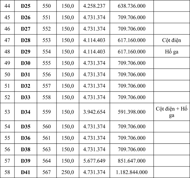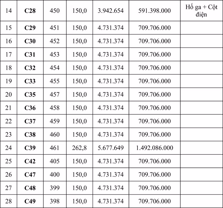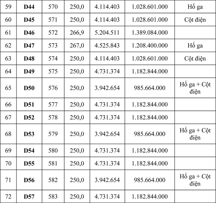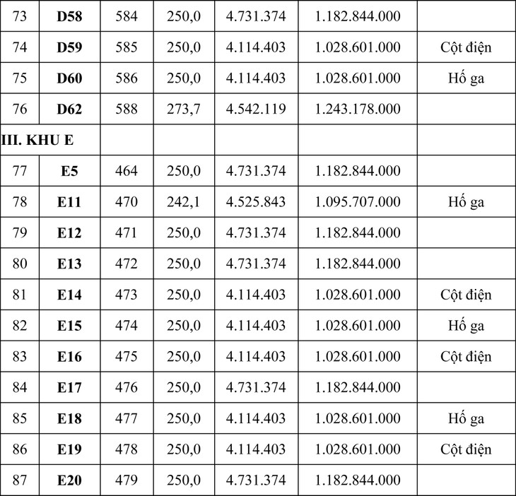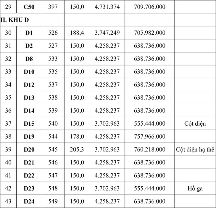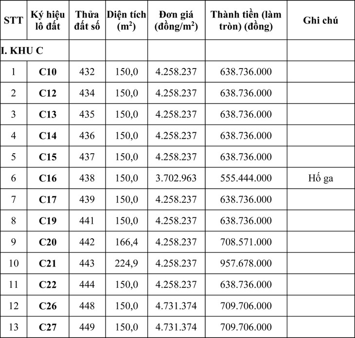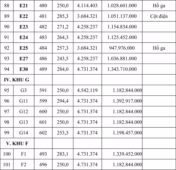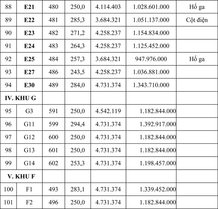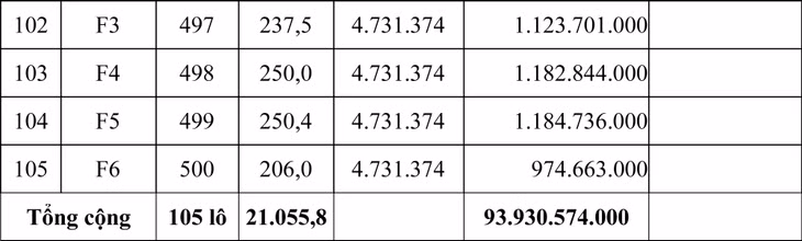 Tổng giá khởi điểm của 105 lô là: 93.930.574.000 đồng (chín mươi ba tỷ, chín trăm ba mươi triệu, năm trăm bảy mươi bốn ngàn đồng).