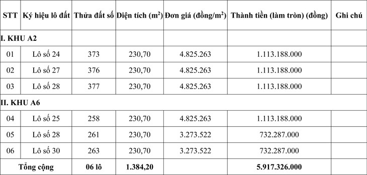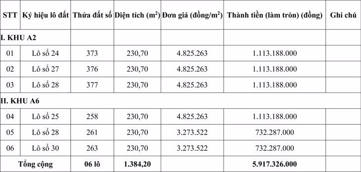 Tổng giá khởi điểm của 06 lô là: 5.917.326.000 đồng (Năm tỷ, chín trăm mười bảy triệu, ba trăm hai mươi sáu ngàn đồng).