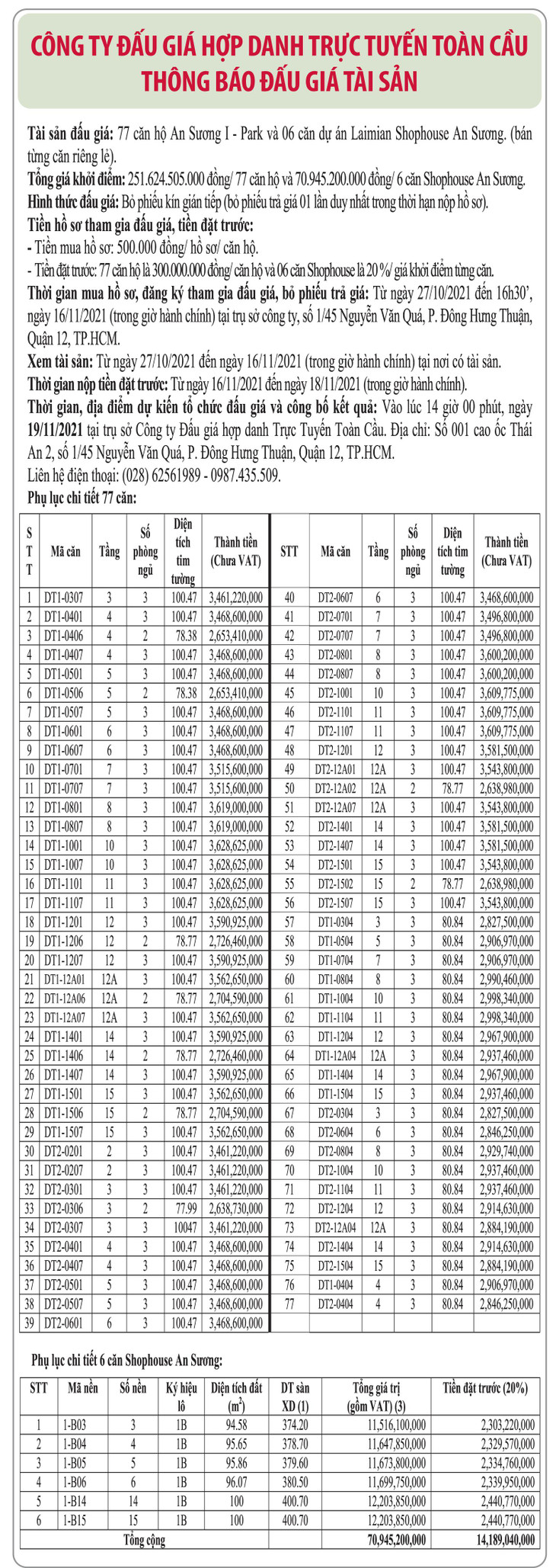 (BĐT) - Công ty Đấu giá hợp danh trực tuyến Toàn Cầu thông báo đấu giá tài sản vào ngày 19/11/2021 như sau: