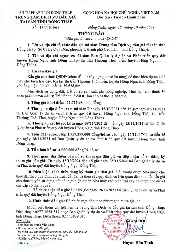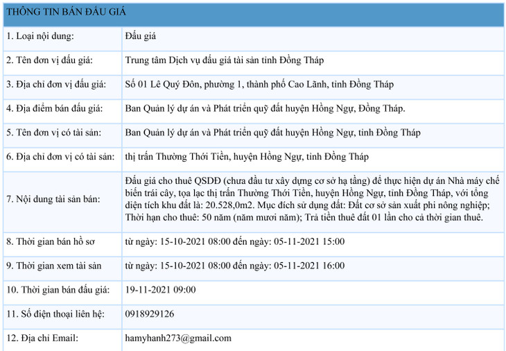 Đấu giá cho thuê QSDĐ (chưa đầu tư xây dựng cơ sở hạ tầng) để thực hiện dự án Nhà máy chế biến trái cây, tọa lạc thị trấn Thường Thới Tiền, huyện Hồng Ngự, tỉnh Đồng Tháp, với tổng diện tích khu đất là: 20.528,0m2. Mục đích sử dụng đất: Đất cơ sở sản xuất phi nông nghiệp; Thời hạn cho thuê: 50 năm (năm mươi năm); Trả tiền thuê đất 01 lần cho cả thời gian thuê.