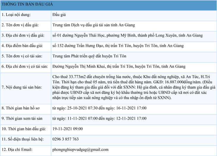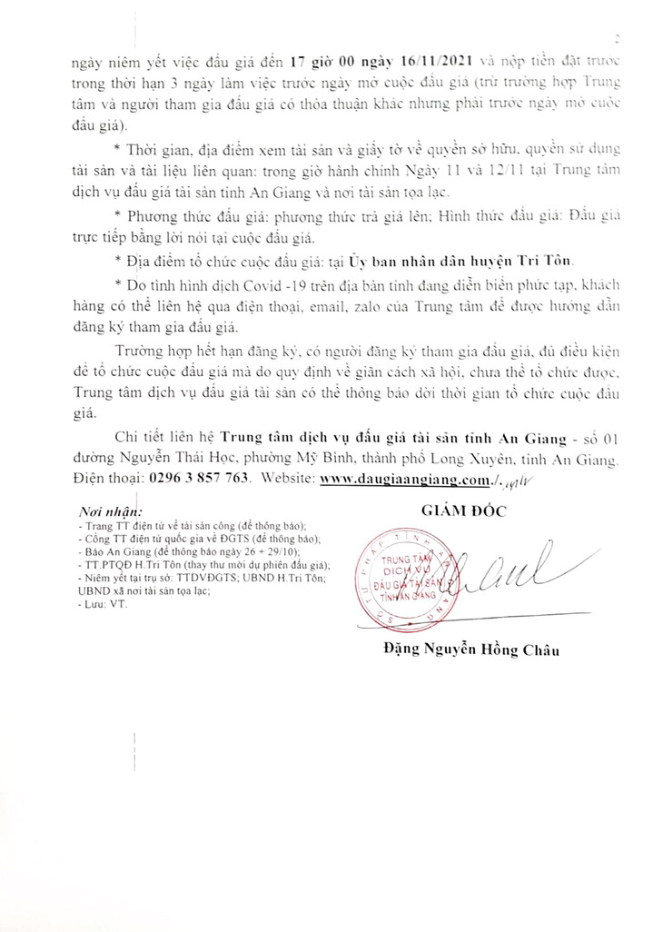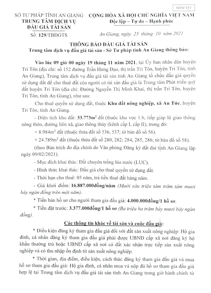 (BĐT) - Trung tâm Dịch vụ đấu giá tài sản tỉnh An Giang thông báo đấu giá tài sản vào ngày 19/11/2021 do Trung tâm Phát triển quỹ đất huyện Tri Tôn ủy quyền như sau: