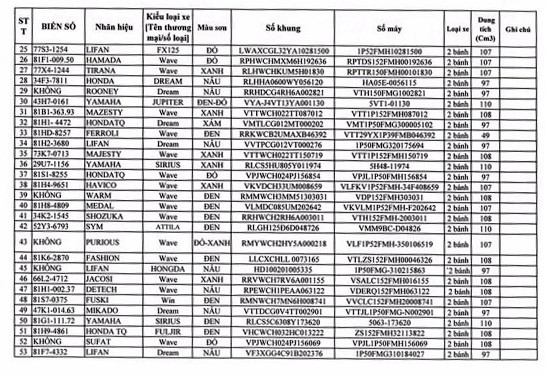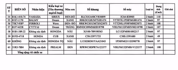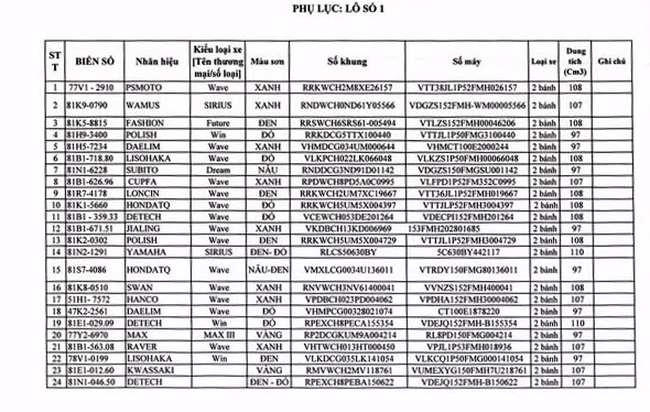 Lô số 1: 61 xe mô tô, xe gắn máy Đăng ký sử dụng lại; Giá khởi điểm: 100.600.000 đồng.