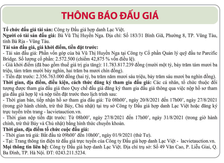 Ngày 1/9/2021, đấu giá 2.572.500 cổ phần Công ty CP Quản lý quỹ đầu tư Parcific