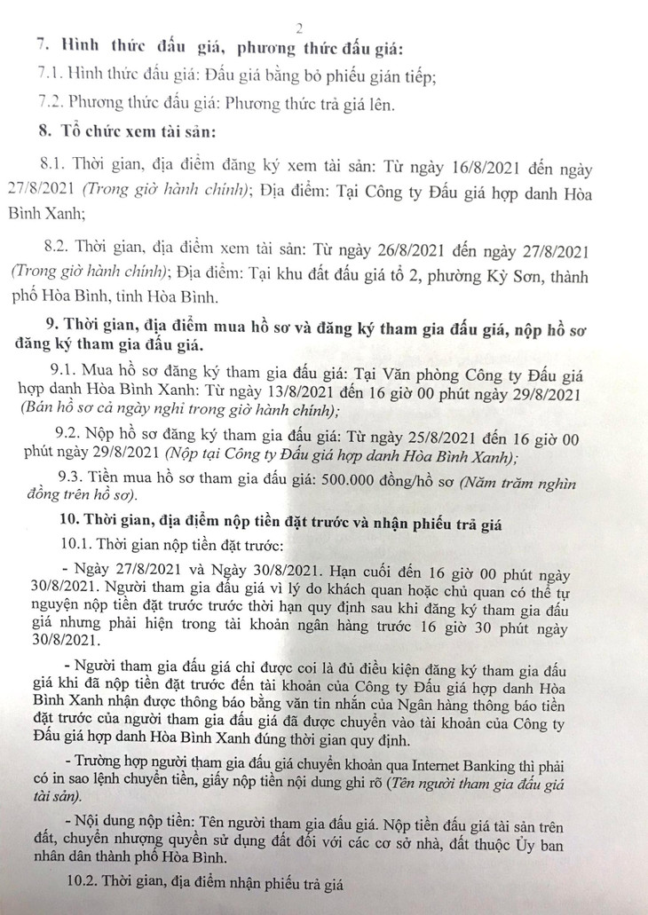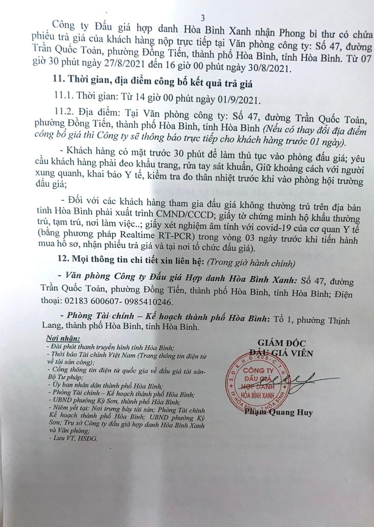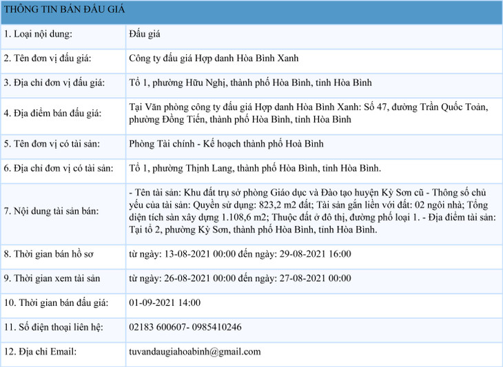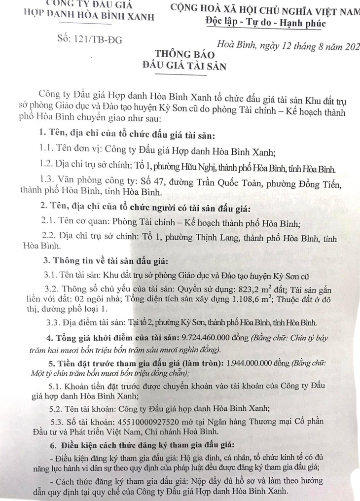 (BĐT) - Công ty Đấu giá hợp danh Hòa Bình Xanh thông báo đấu giá tài sản vào ngày 1/9/2021 do Phòng Tài chính - Kế hoạch thành phố Hoà Bình ủy quyền như sau: