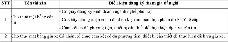 c) Đặc điểm tài sản: Cho thuê mặt bằng căn tin và mặt bằng giữ xe, chi tiết như sau: