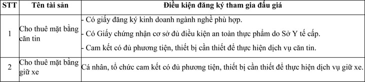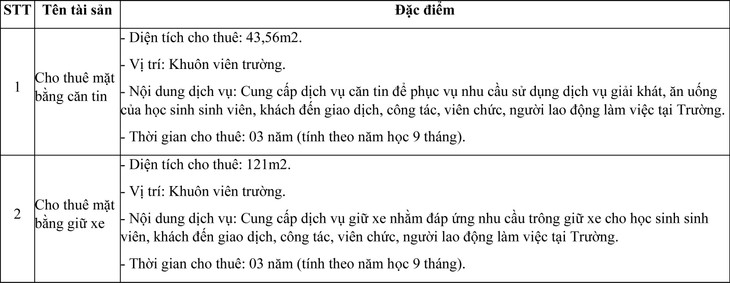 c) Đặc điểm tài sản: Cho thuê mặt bằng căn tin và mặt bằng giữ xe, chi tiết như sau: