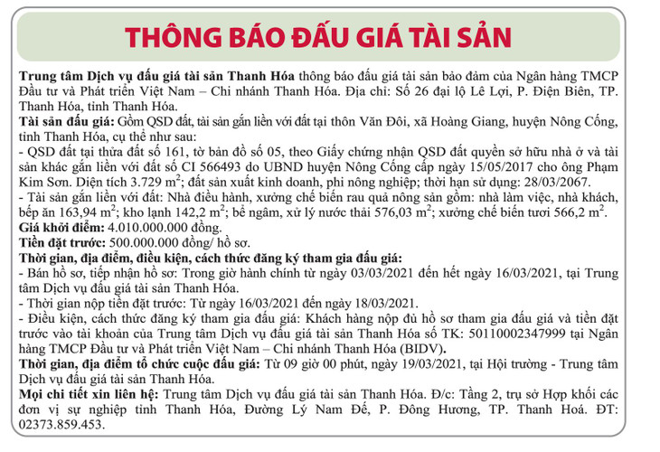 (BĐT) - Trung tâm Dịch vụ Đấu giá tài sản Thanh Hóa thông báo đấu giá tài sản vào ngày 19/3/2021 do Ngân hàng Đầu tư và Phát triển Chi nhánh Thanh Hóa ủy quyền như sau:
