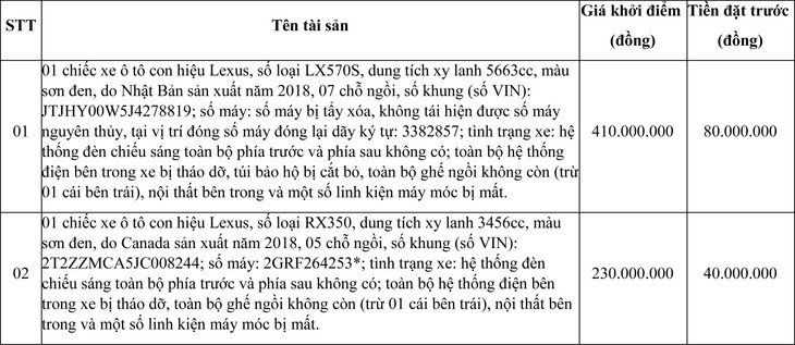 - Xe ô tô con hiệu Lexus, số loại LX570S: Tiền đặt trước: 80.000.000 đồng.