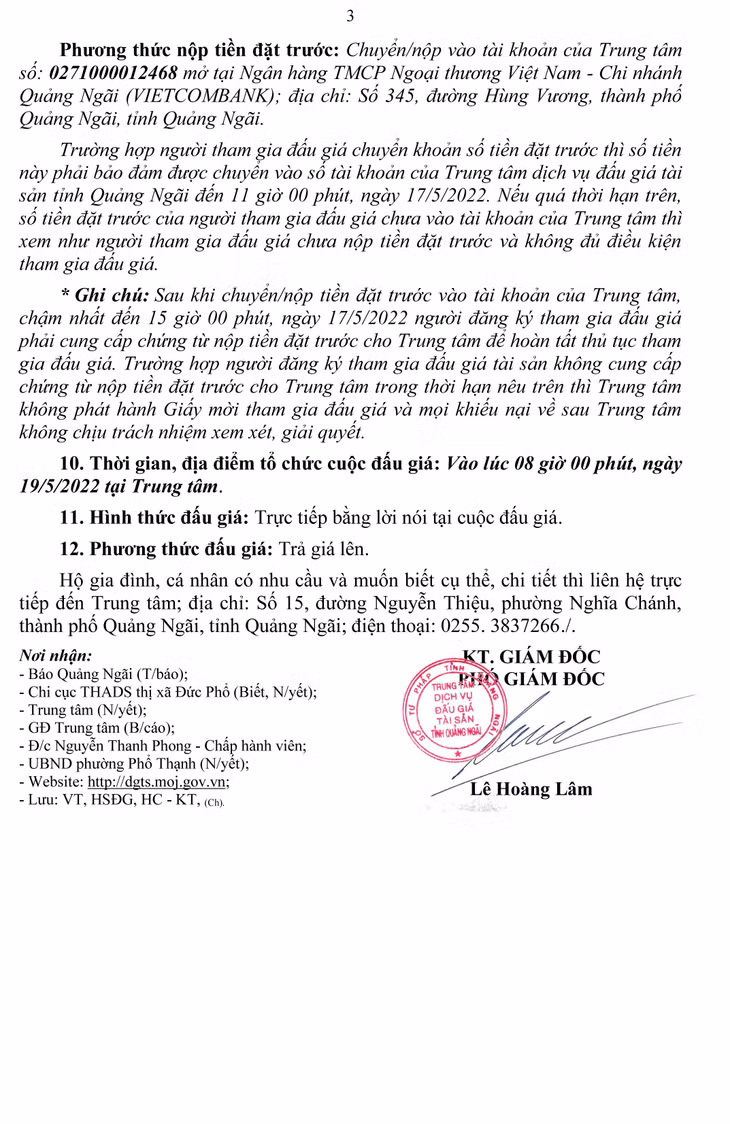 Tổ chức đấu giá tài sản: Trung tâm Dịch vụ đấu giá tài sản tỉnh Quảng Ngãi