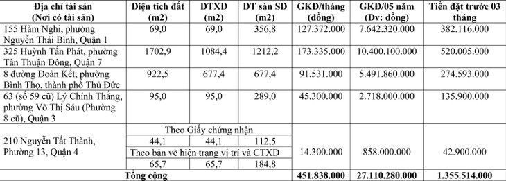 Tài sản cho thuê: Tài sản nhà, đất tại TP. Hồ Chí Minh, cụ thể:
